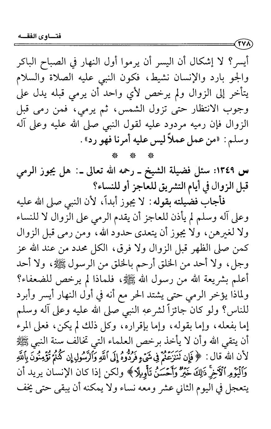 فأجاب فضيلته بقوله: لا يجوز أبداً، لأن النبي صلى الله عليه وعلى آله وسلم لم يأذن للعاجز أن يقدم الرمي على الزوال لا للنساء ولا لغيرهن، ولا يجوز أن يتعدى حدود الله، ومن رمى قبل الزوال كمن صلى الظهر قبل الزوال ولا فرق، الكل محدد من عند الله عز وجل، ولا أحد من الخلق أرحم بالخلق من الرسول - صلى الله عليه وسلم -، ولا أحد أعلم بشريعة الله من رسول الله - صلى الله عليه وسلم -، فلماذا لم يرخص للضعفاء؟ ولماذا يؤخر الرمي حتى يشتد الحر مع أنه في أول النهار أيسر وأبرد للناس؟ ولو كان جائزاً لشرعه النبي صلى الله عليه وعلى آله وسلم