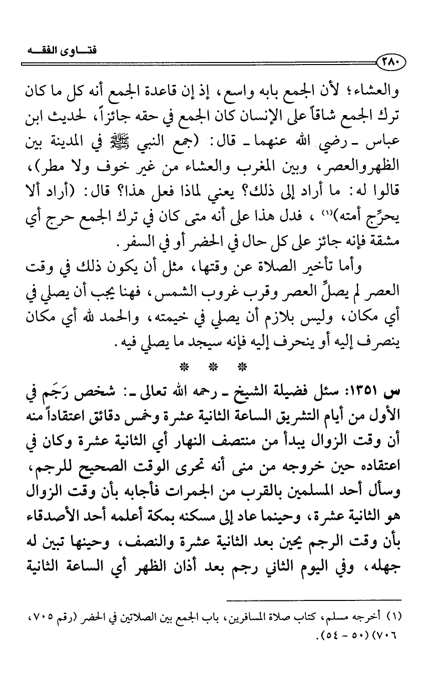 (1) أخرجه مسلم، كتاب صلاة المسافرين، باب الجمع بين الصلاتين في الحضر (رقم 755،