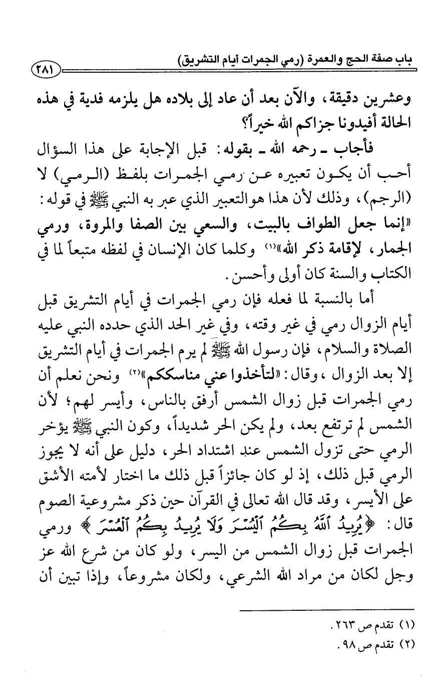 فأجاب- رحمه الله- بقوله: قبل الإجابة على هذا السؤال أحب أن يكون تعبيره عن رمي الجمرات بلفظ (الرمي) لا (الرجم) ، وذلك لأن هذا هو التعبير الذي عبر به النبي - صلى الله عليه وسلم - في قوله: "إنما جعل الطواف بالبيت، والسعي بين الصفا والمروة، ورمي الجمار، لإقامة ذكر الله" (1) وكلما كان الإنسان في لفظه متبعاً لما في الكتاب والسنة كان أولى وأحسن.