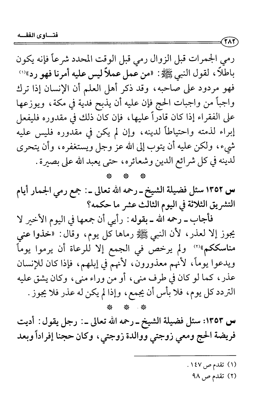 فأجاب- رحمه الله- بقوله: رأي أن جمعها في اليوم الأخير لا لمجوز إلا لعذر، لأن النبي - صلى الله عليه وسلم - رماها كل يوم، وقال: "خذوا عني مناسككم" (2) ولم يرخص في الجمع إلا للرعاة أن يرموا يوماً ويدعوا يوماً، لأنهم معذورون، لأنهم في إبلهم، فإذا كان للإنسان عذر، كما لو كان في طرف منى، أو من وراء منى، وكان يشق عليه التردد كل يوم، فلا بأس أن لمجمع، وإذا لم يكن له عذر فلا يجوز.