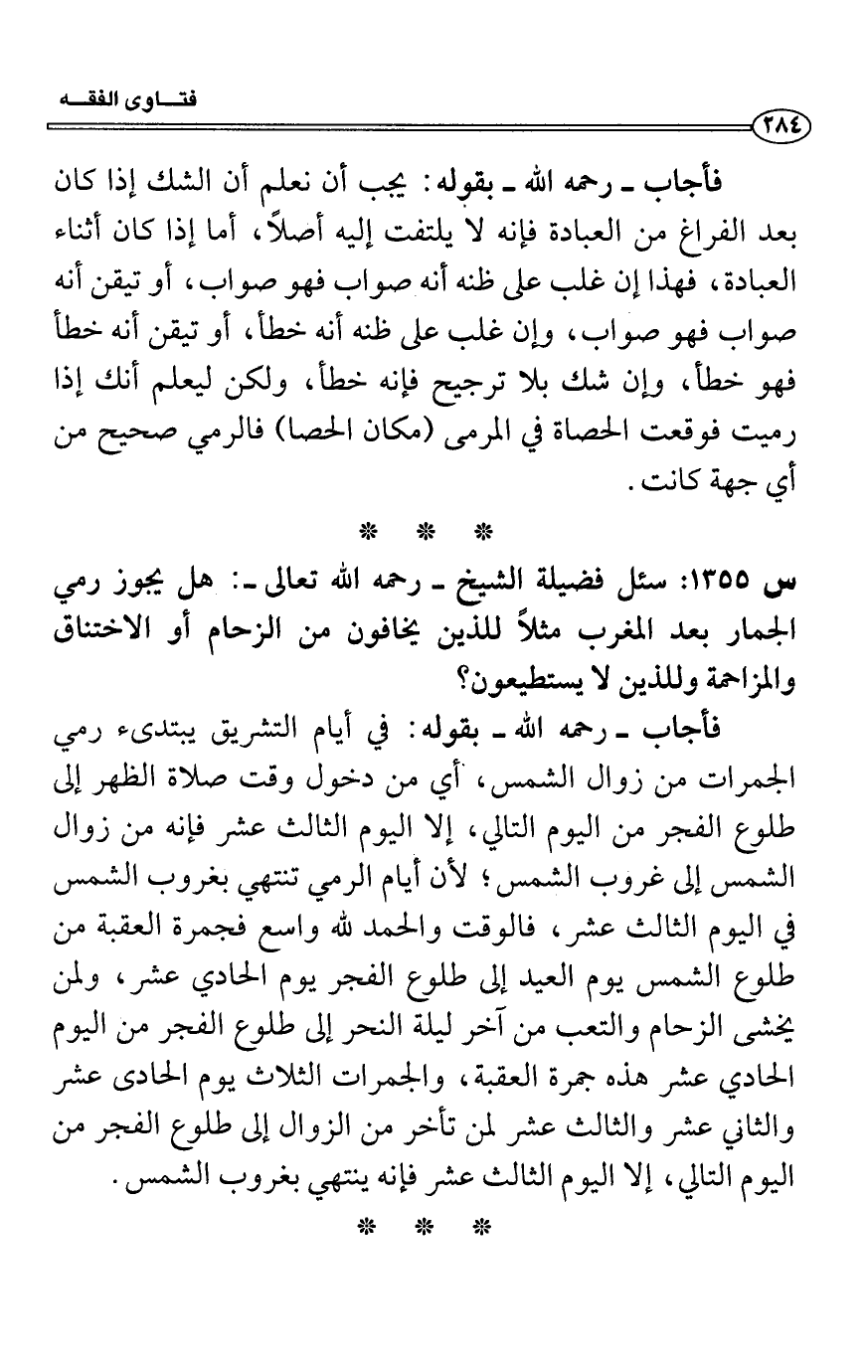 فأجاب- رحمه الله- بقوله: في أيام التشويق يبتدئ رمي الجمرات من زوال الشمس؛ أي من دخول وقت صلاة الظهر إلى طلوع المْجر من اليوم التالي، إلا اليوم الثالث عشر فإنه من زوال الشمس إلى غروب الشمس؛ لأن أيام الرمي تنتهي بغروب الشمس في اليوم الثالث عشر، فالوقت والحمد لله واسع فجمرة العقبة من طلوع الشمس يوم العيد إلى طلوع الفجر يوم الحادي عشر، ولمن يخشى الزحام والتعب من آخر ليلة النحر إلى طلوع الفجر من اليوم الحادي عشر هذه جمرة العقبة، والجمرات الثلاث يوم الحادي عشر والثاني عشر والثالث عشر لمن تأخر من الزوال إلى طلوع الفجر من اليوم التالي، إلا اليوم الثالث عشر فإنه ينتهي بغروب الشمس.