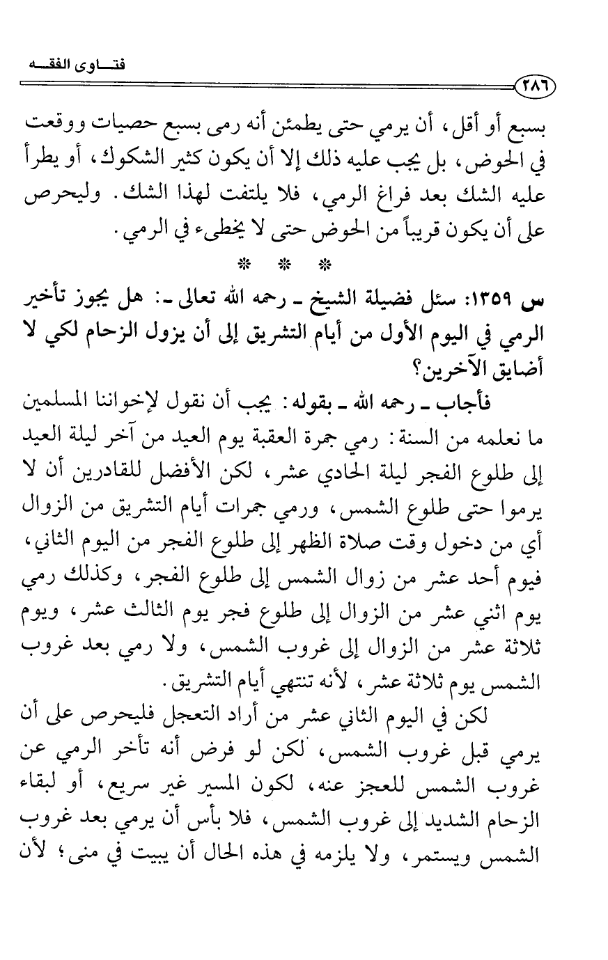 س1359: سئل فضيلة الشيخ -رَحمه إلا اَلله تعالى-: هل يجوز تأخير الرمي في اليوم الأول من أيام التشريق إلى أن يزول الزحام لكي لا أضايق الآخرين؟