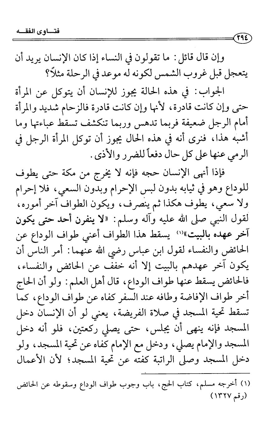 (1) أخرجه مسلم، كتاب الحج، باب وجوب طواف الوداع وسقوطه عن الحائض (رقم 1327) .