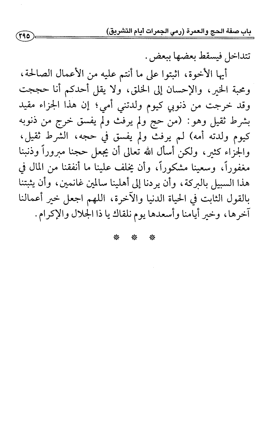 أيها الأخوة، اثبتوا على ما أنتم عليه من الأعمال الصالحة، ومحبة الخير، والإحسان إلى الخلق، ولا يقل أحدكم أنا حججت وقد خرجت من ذنوبي كيوم ولدتني أمي؟ إن هذا الجزاء مقيد بشرط ثقيل وهو: (من حج ولم يرفث ولم يفسق خرج من ذنوبه كيوم ولدته أمه) لم يرفث ولم يفسق في حجه، الشرط ثقيل، والجزاء كثير، ولكن أسأل الله تعالى أن يجعل حجنا مبروراً وذنبنا مغفوراً، وسعينا مشكوراً، وأن يخلف علينا ما أنفقنا من المال في هذا السبيل بالبركة، وأن يردنا إلى أهلينا سالمين غانمين، وأن يثبتنا بالقول الثابت في الحياة الدنيا والآخرة، اللهم اجعل خير أعمالنا آخرها، وخير أيامنا وأسعدها يوم نلقاك يا ذا الجلال والإكرام.
