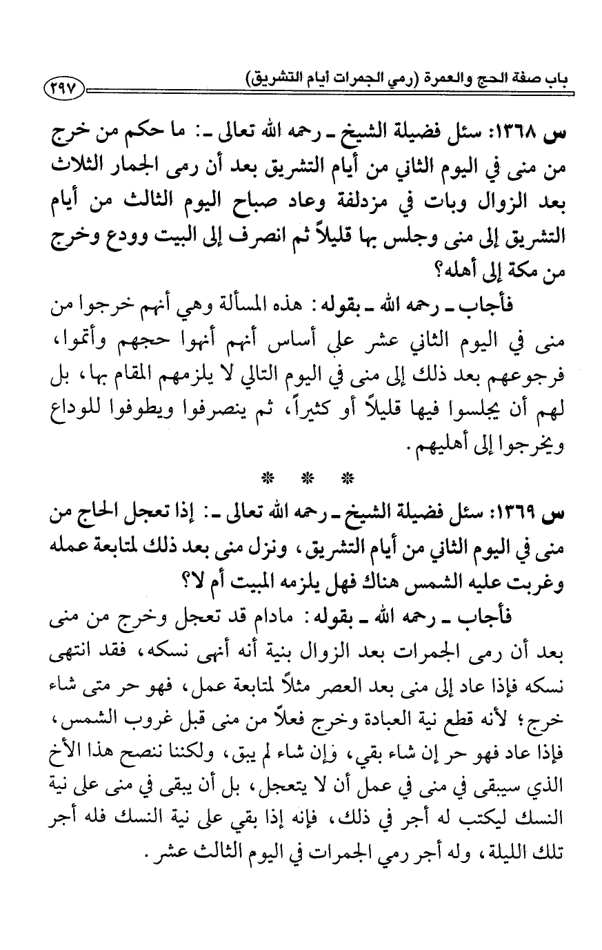 س1368: سئل فضيلة الشيخ- رحمه الله تعالى-: ما حكم من خرج من منى في اليوم الثاني من أيام التشريق بعد أن رمى الجمار الثلاث يعد الزوال وبات في مزدلفة وعاد صباح اليوم الثالث من أيام