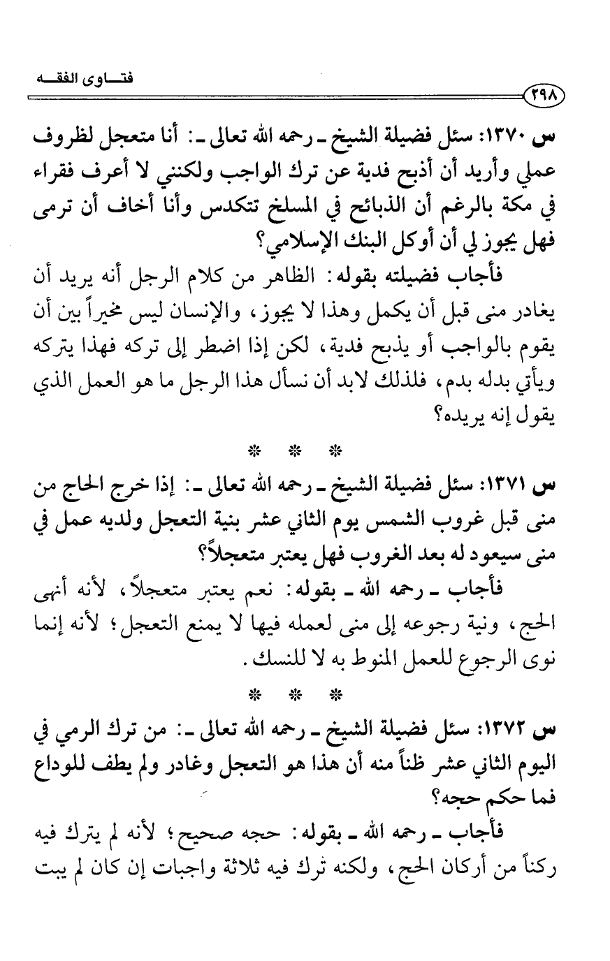 س1370: سئل فضيلة الشيخ- رحمه الله تعالى-: أنا متعجل لظروف عملي وأريد أن أذبح فدية عن ترك الواجب ولكنني لا أعرف فقراء في مكة بالرغم أن الذبائح في المسلخ تتكدس وأنا أخاف أن ترمى فهل يجوز لي أن أوكل البنك الإسلامي؟