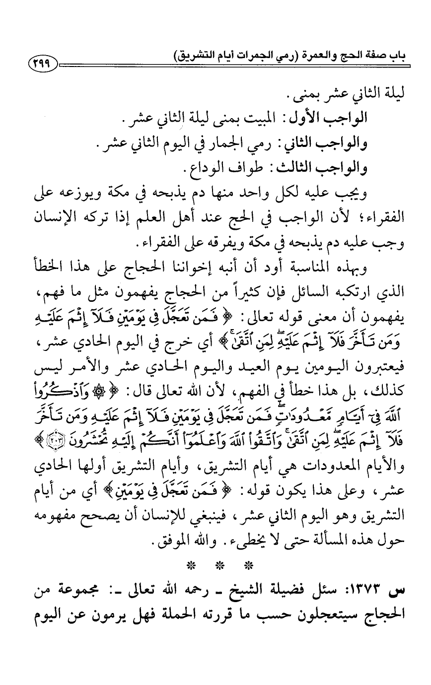 وبهذه الناسبة أود أن أنبه إخواننا الحجاج على هذا الخطأ الذي ارتكبه السائل فإن كثيراً من الحجاج يفهمون مثل ما فهم، يفهمون أن معنى قوله تعالى: (فَمَنْ تَعَجَّلَ فِي يَوْمَيْنِ فَلَا إِثْمَ عَلَيْهِ وَمَنْ تَأَخَّرَ فَلَا إِثْمَ عَلَيْهِ لِمَنِ اتَّقَى) أي خرج في اليوم الحادي عشر، فيعتبرون اليومين يوم العيد واليوم الحادي عشر والأمر ليس كذلك، بل هذا خطأ الفهم.، لأن الله تعالما قال: (وَاذْكُرُوا الله فِي أَيَّامٍ مَعْدُودَاتٍ فَمَنْ تَعَجَّلَ فِي يَوْمَيْنِ فَلَا إِثْمَ عَلَيْهِ وَمَنْ تَأَخَّرَ فَلَا إِثْمَ عَلَيْهِ لِمَنِ اتَّقَى وَاتَّقُوا الله وَاعْلَمُوا أَنَّكُمْ إِلَيْهِ تُحْشَرُونَ) والأيام المعدودات هي أيام التشريق، وأيام التشريق أولها الحادي عشر، وعلى هذا يكون قوله: (فَمَنْ تَعَجَّلَ فِي يَوْمَيْنِ) أي من أيام التشريق وهو اليوم الثاني عشر، فينبغي للإنسان أن يصحح مفهومه حول هذه المسألة حتى لا يخطئ. والله الموفق.