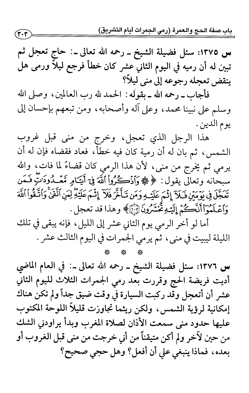 س1376: سئل فضيلة الشيخ- رحمه الله تعالى-: في العام الماضي أديت فريضة الحج وقررت بعد رمي الجمرات الثلاث لليوم الثاني عشر أن أتعجل وقد ركبت السيارة في وقت ضيق جداً ولم تكن هناك إمكانية لرؤية الشمس، ولكن ريثما تجاوزت قليلاً للوحة المكتوب عليها حدود منى سمعت الأذان لصلاة المغرب وبدأ يراودني الشك من حين لآخر ولم أكن متيقناً من أني خرجت من منى قبل الغروب أو بعده، فماذا ينبغي علي أن أفعل؟ وهل حجي صحيح؟