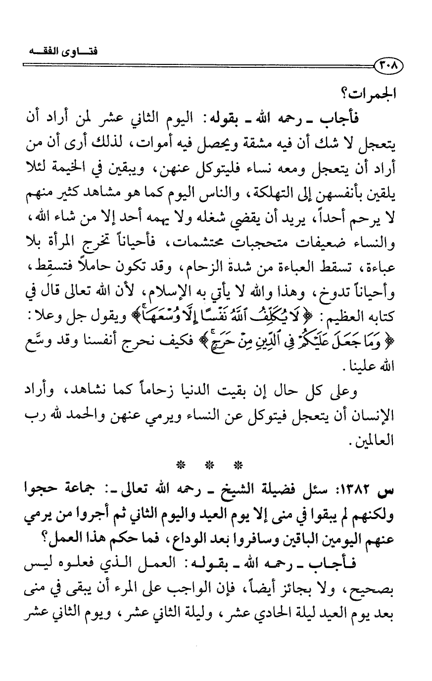 فأجاب- رحمه الله- بقوله: اليوم الثاني عشر لمن أراد أن يتعجل لا شك أن فيه مشقة ويحصل فيه أموات، لذلك أوى أن من أواد أَن يتعجل ومعه نساء فليتوكل عنهن، ويبقيا في الخيمة لئلا يلقين بأنفسهن إلى التهلكة، والناس اليوم كما هو مشاهد كثير منهم لا يرحم أحداً، يريد أن يقضي شغله ولا يهمه أحد إلا من شاء الله، والنساء ضعيفات متحجبات محتشمات، فأحياناً تخرج المرأة بلا
