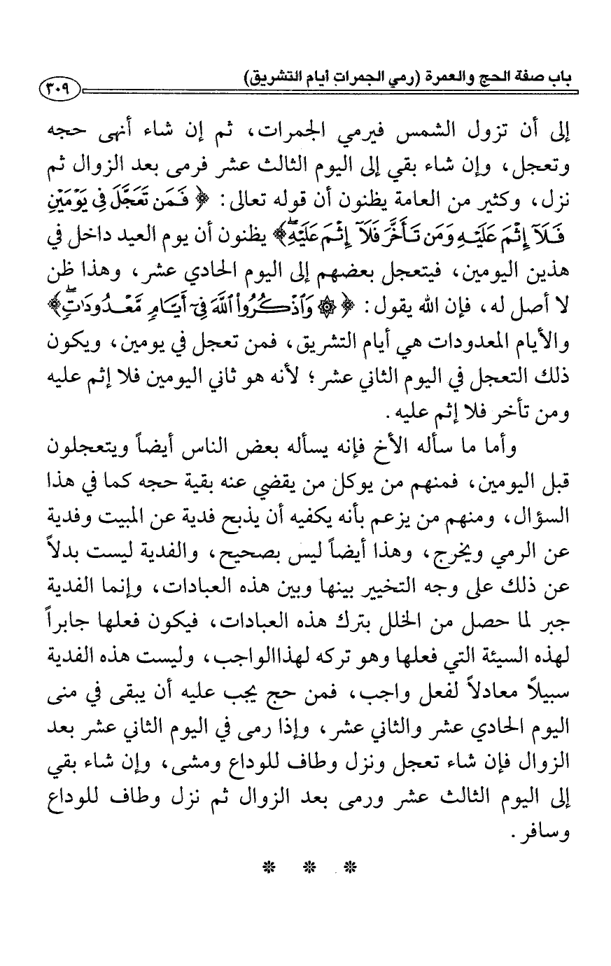 إلى أن تزول الشمس فيرمي الجمرات، ثم إن شاء أنهى حجه وتعجل، وإن شاء بقي إلى اليوم الثالث عشر فرمى بعد الزوال ثم نزل، وكثير من العامةْ يظنون أن قوله تعالى: (فَمَنْ تَعَجَّلَ فِي يَوْمَيْنِ فَلَا إِثْمَ عَلَيْهِ وَمَنْ تَأَخَّرَ فَلَا إِثْمَ عَلَيْهِ) يظنون أن يوم العيد داخل في هذين اليومين، فيتعجل بعضهم إلى اليوم الحادي عشر، وهذا ظن لا أصل له، فإن الله يقول: (وَاذْكُرُوا الله فِي أَيَّامٍ مَعْدُودَاتٍ) والأيام المعدودات هي أيام التشريق، فمن تعجل في يومين، ويكون ذلك التعجل في اليوم الثاني عشر؛ لأنه هو ثاني اليومين فلا إثم عليه ومن تأخر فلا إثم عليه.
