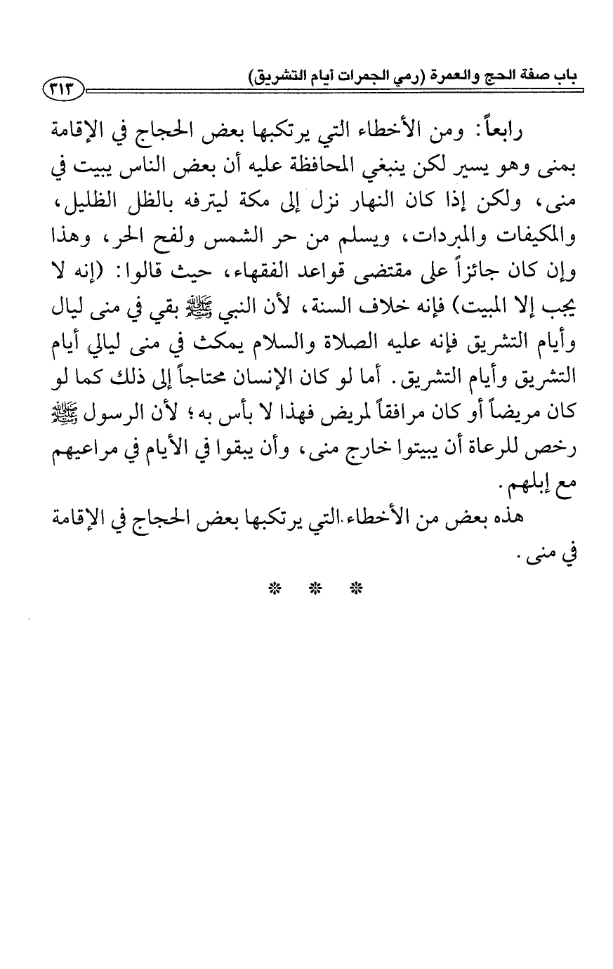 رابعاً: ومن الأخطاء التي يرتكبها بعض الحجاج في الإقامة بمنى وهو يسير لكن ينبغي المحافظة عليه أن بعض الناس يبيت في منى، ولكن إذا كان النهار نزل إلى مكة ليترفه بالظل الظليل، والمكيفات والمبردات، ويسلم من حو الشمس ولفح الحر، وهذا وإن كان جائزاً على مقتضى قواعد الفقهاء، حيث قالوا: (إنه لا يجب إلا المبيت) فإنه خلاف السنة، لأن النبي - صلى الله عليه وسلم - بقي في منى ليال وأيام التشريق فإنه عليه الصلاة والسلام يمكث في منى ليالي أيام التشريق وأيام التشريق. أما لو كان الإنسان محتاجاً إلى ذلك كما لو كان مريضاً أو كان مرافقاً لمريض لا بأس به؛ لأن الرسول - صلى الله عليه وسلم - وخص للرعاة أن يبيتوا خارج منى، وأن يبقوا في الأيام في مراعيهم