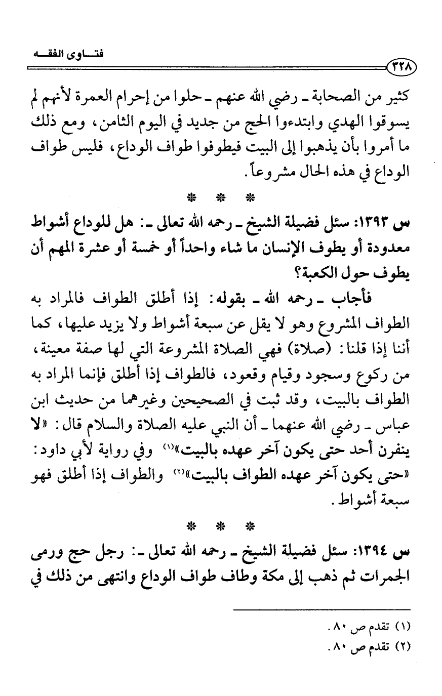 فأجاب- رحمه الله- بقوله: إذا أطلق الطواف فالمراد به الطواف المشروع وهو لا يقل عن سبعة أشواط ولا يزيد عليها، كما أننا إذا قلنا: (صلاة) فهي الصلاة المشروعة التي لها صفة معينة، من ركوع وسجود وقيام وقعود، فالطواف إذا أطلق فإنما المراد به الطواف بالبيت، وقد ثبت في الصحيحين، وغيرهما من حديث ابن عباس- رضي الله عنهما- أن النبي عليه الصلاة والسلام قال: "لا ينفرن أحد حتى يكون آخر عهده بالبيت" (1) وفي رواية لأبى داود: لا حتى يكون آخر عهده الطواف بالبيت" (2) والطواف إذا أطلق فهو سبعة أشواط.