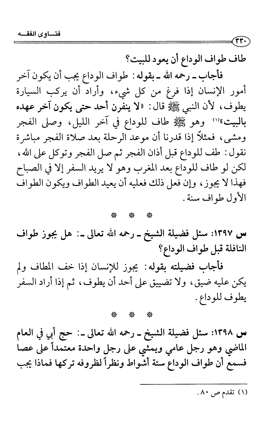 س1397: سئل فضيلة الشيخ- رحمه الله تعالى-: هل يجوز طواف النافلة قبل طواف الوداع؟