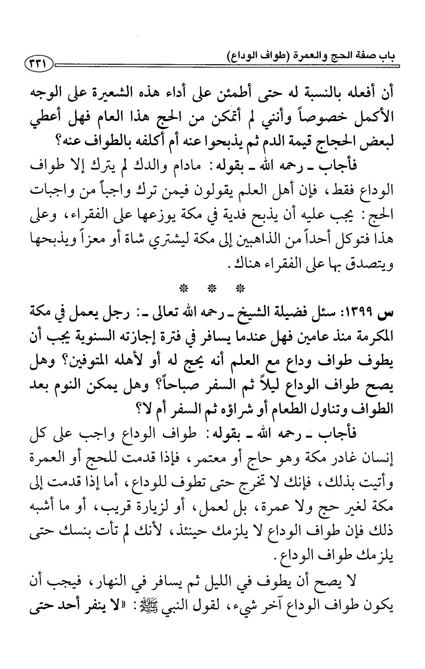 فأجاب- رحمه الله- بقوله: طواف الوداع واجب على كل إنسان غادر مكة وهو حاج أو معتمر، فإذا قدمت للحج أو العمرة وأتيت بذلك، فإنك لا تخرج حتى تطوف للوداع، أما إذا قدمت إلى