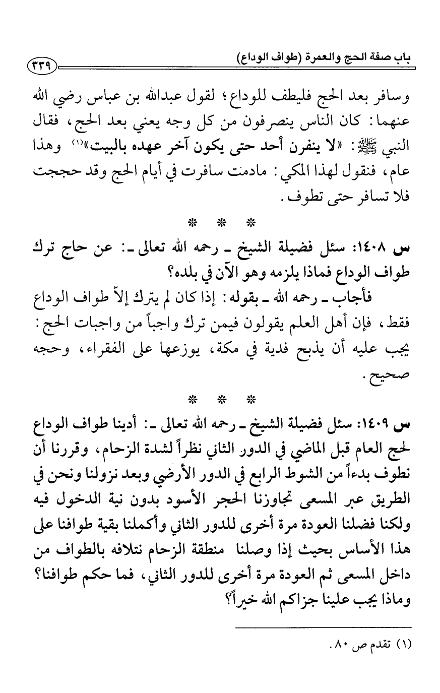 وسافر بعد الحج فليطف للوداع، لقول عبد الله بن عباس رضي الله عنهما: كان الناس ينصرفون من كل وجه يعني بعد الحج، فقال النبي - صلى الله عليه وسلم -: "لا ينفرن أحد حتى يكون آخر عهده بالبيت" (1) وهذا عام، فنقول لهذا المكي: ما دمت سافرت في أيام الحج وقد حججت