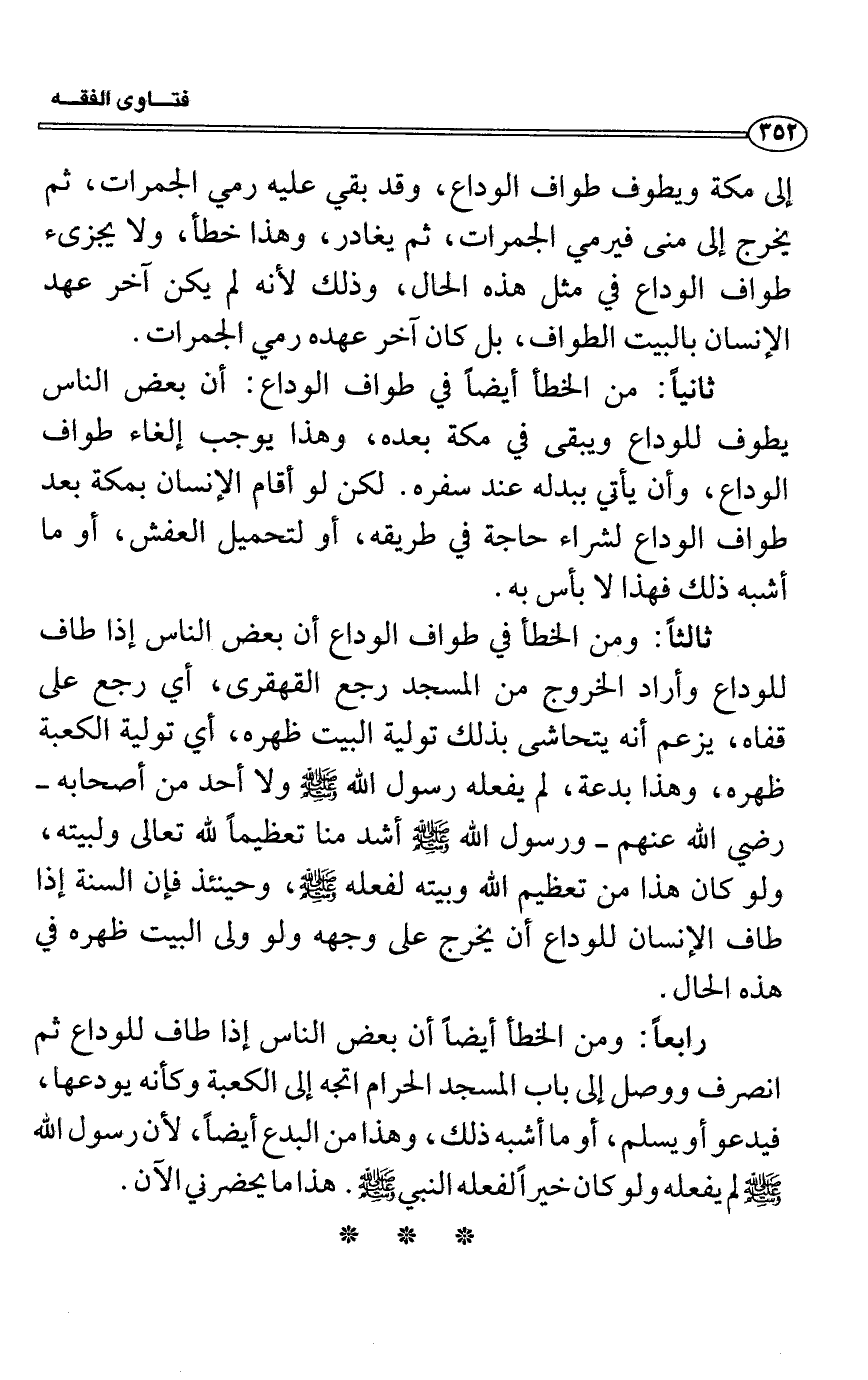 رابعاً: ومن الخطأ أيضاً أن بعض الناس إذا طاف للوداع ثم أَنصرف ووصل إلى باب المسجد الحرام اتجه إلى الكعبة وكأنه يودعها، فيدعو أو يسلم، أو ما أشبه ذلك، وهذا من البدع أيضاً، لأن رسول الله - صلى الله عليه وسلم - لم يفعله ولو كان خير اً لفعله النبي - صلى الله عليه وسلم -. هذا ما يحضر في الآن.