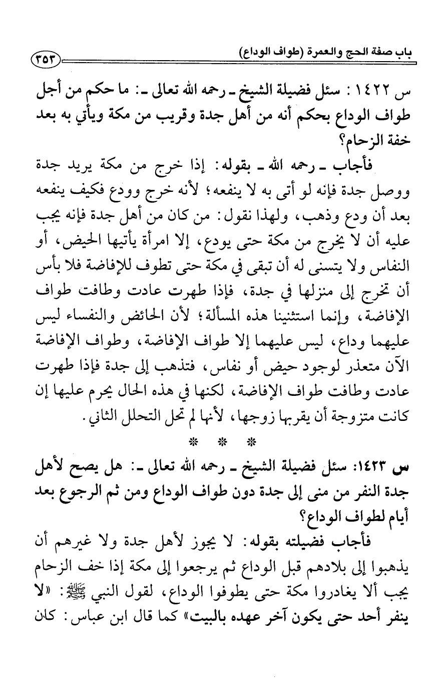 س1423: سئل فضيلة الشيخ- رحمه الله تعالى-: هل يصح لأهل جدة النفر من منى إلى جدة دون طواف الوداع ومن ثم الرجوع بعد أيام لطواف الوداع؟