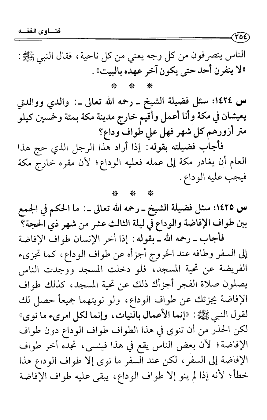 س1424: سئل فضيلة الشيخ- رحمه الله تعالى-: والدي ووالدتي يعيشان في مكة وأنا أعمل وأقيم خارج مدينة مكة بمئة وخمسين كيلو متر أزورهم كل شهر فهل علي طواف وداع؟