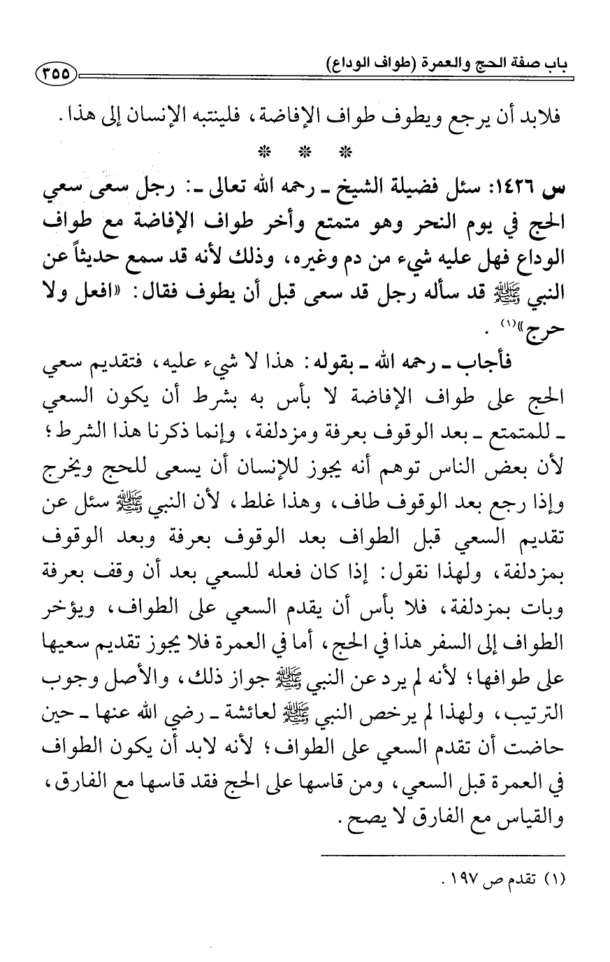 فأجاب- رحمه الله- بقوله: هذا لا شيء عليه، فتقديم سعي الحج على طواف الإفاضة لا بأس به بشرط أن يكون السعي - للمتمتع- بعد الوقوف بعرفة ومزدلفة، وإنما ذكرنا هذا الشرط؛