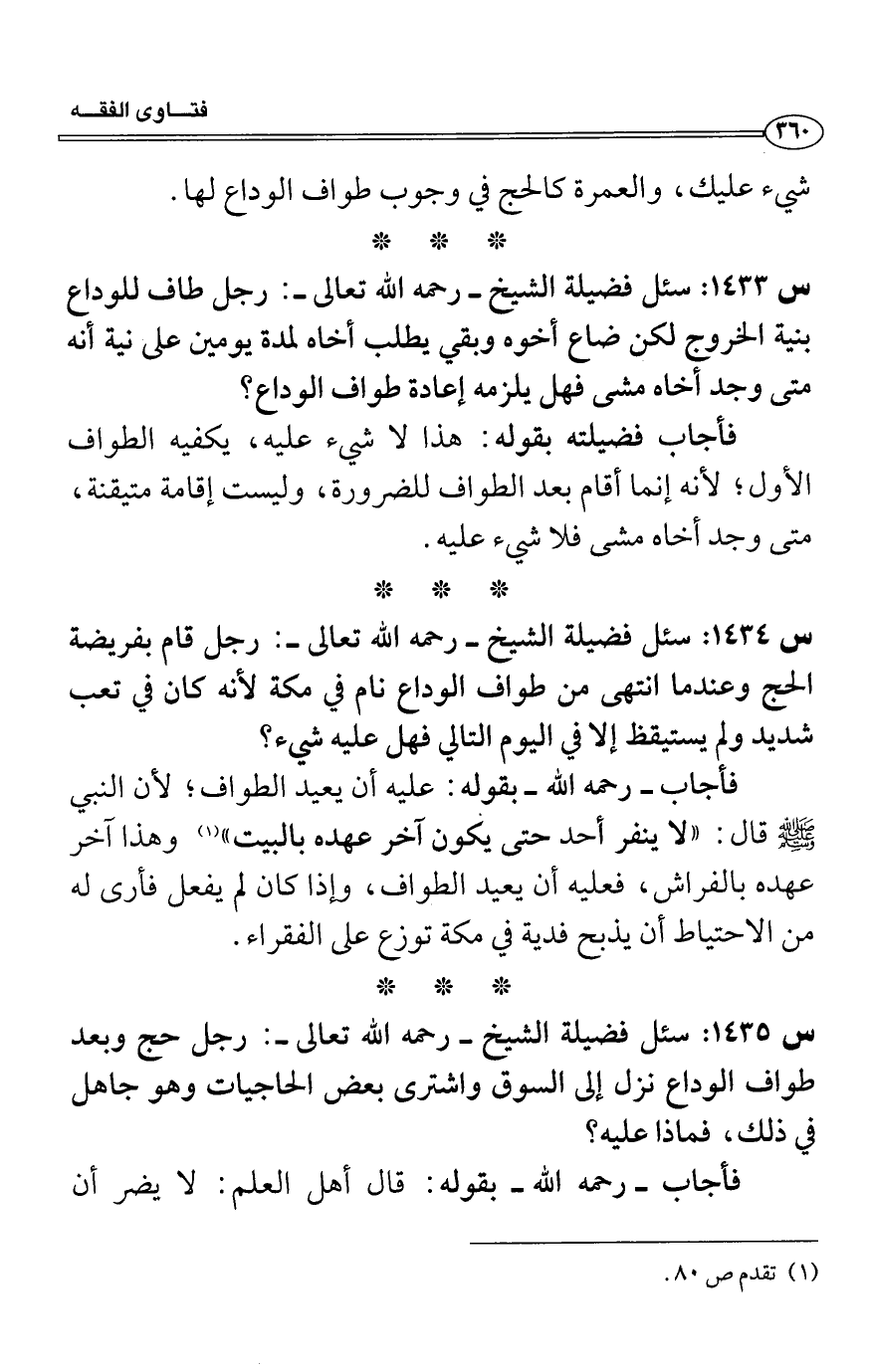 فأجاب- رحمه الله- بقوله: عليه أن يعيد الطواف، لأن النبي - صلى الله عليه وسلم - قال: "لا ينفر أحد حتى يكون آخر عهده بالبيت" (1) وهذا آخر عهده بالفراش، فعليه أن يعيد الطواف، وإذا كان لم يفعل فأرى له من الاحتياط أن يذبح فدية في مكة توزع على الفقراء.