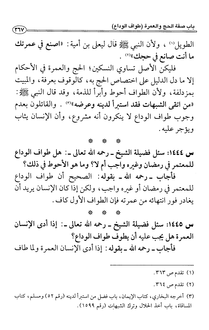 فليكن الأصل تساوي النسكين، الحج والعمرة في الأحكام إلا ما دل الدليل على اختصاص الحج به، كالوقوف بعرفة، والمبيت بمزدلفة، ولأن الطواف أحوط وأبرأ للذمة، وقد قال النبي - صلى الله عليه وسلم -: "من اتقى الشبهات فقد استبرأ لدينه وعرضه " (3) . والقائلون بعدم وجوب طواف الوداع لا ينكرون أنه مشروع، وأن الإنسان يثاب ويؤجر عليه.