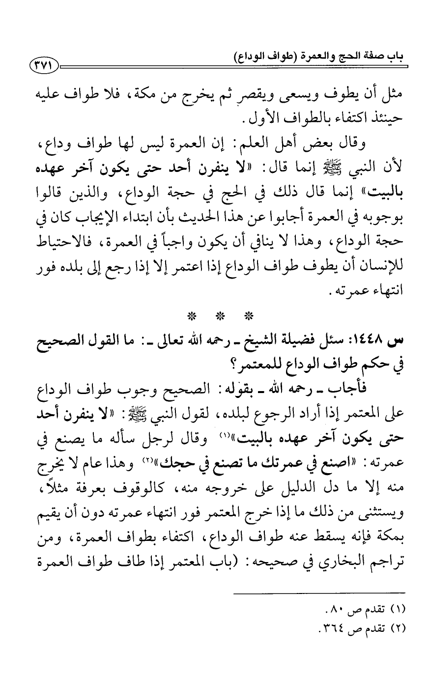 س1448: سئل فضيلة الشيخ- رحمه الله تعالى-: ما القول الصحيح في حكم طواف الوداع للمعتمر؟