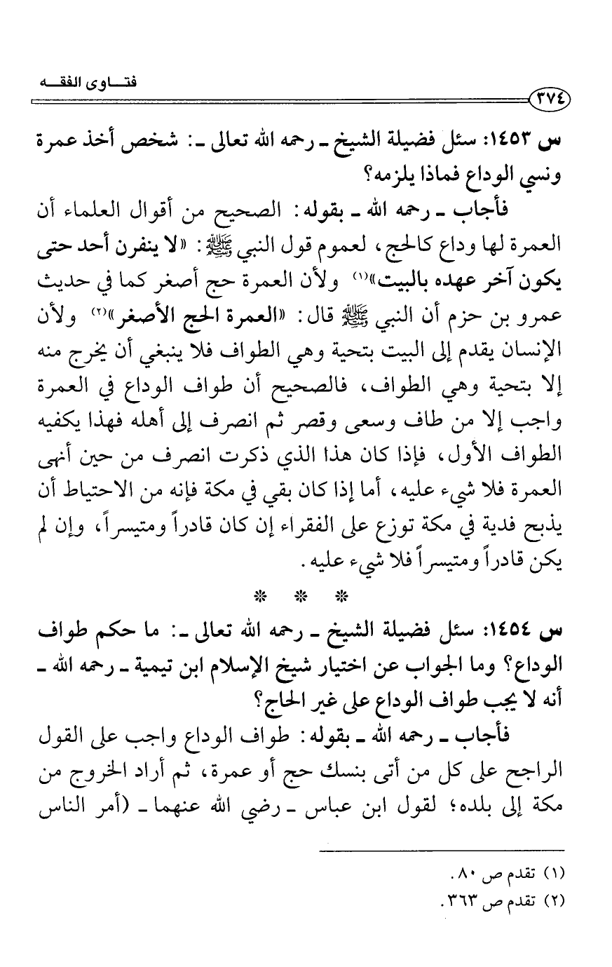 س1454: سئل فضيلة الشيخ- رحمه الله تعالى-: ما حكم طواف الوداع؟ وما الجواب عن اختيار شيخ الإسلام ابن تيمية- رحمه الله- أنه لا يجب طواف الوداع على غير الحاج؟