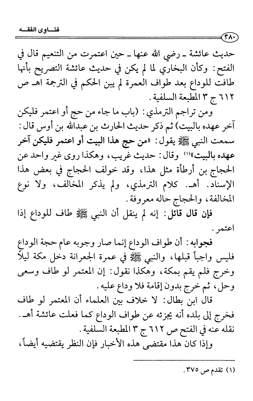 حديث عائشة- رضي الله عنها- حين اعتمرت من التنعيم قال في الفتح: وكأن البخاري لما لم يكن في حديث عائشة التصريح بأنها طافت للوداع بعد طواف العمرة لم يبن الحكم في الترجمة اهـ ص
