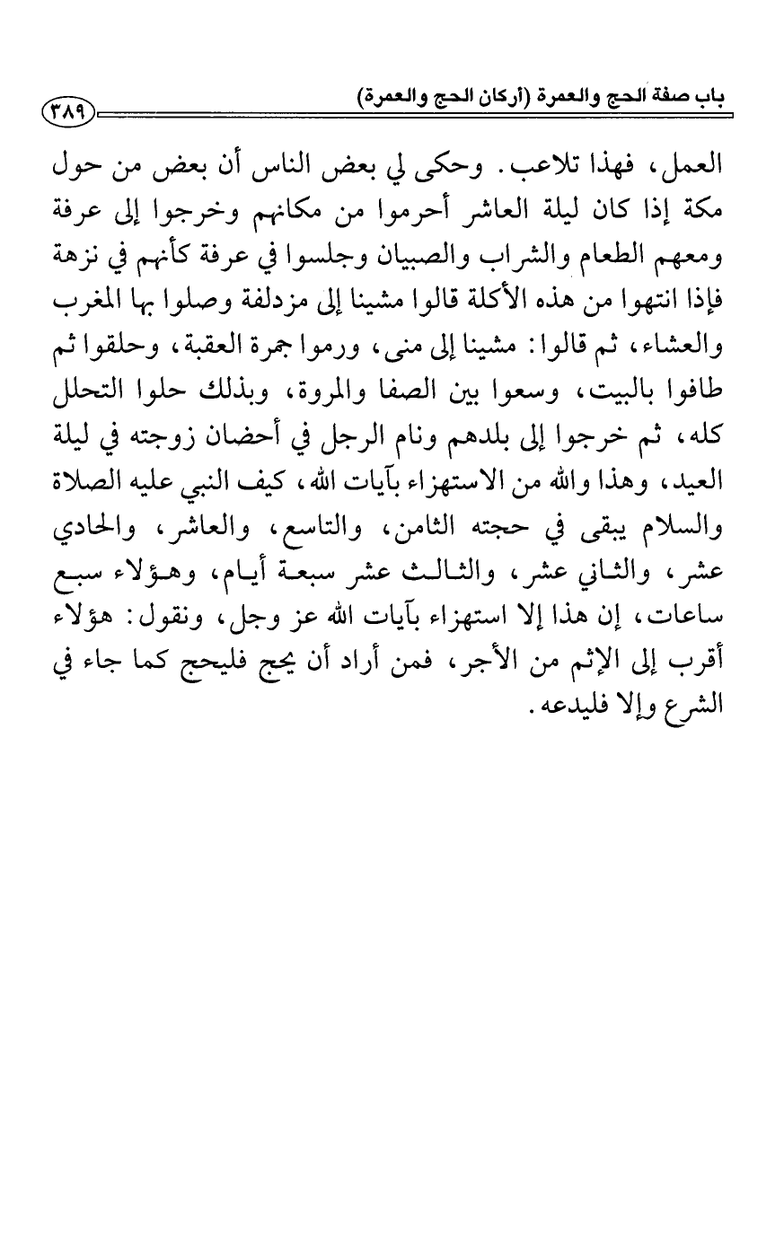 العمل، فهذا تلاعب. وحكى لي بعض الناس أن بعض من حول مكة إذا كان ليلة العاشر أحرموا من مكانهم وخرجوا إلى عرفة ومعهم الطعام والشراب والصبيان وجلسوا في عرفة كأنهم في نزهة