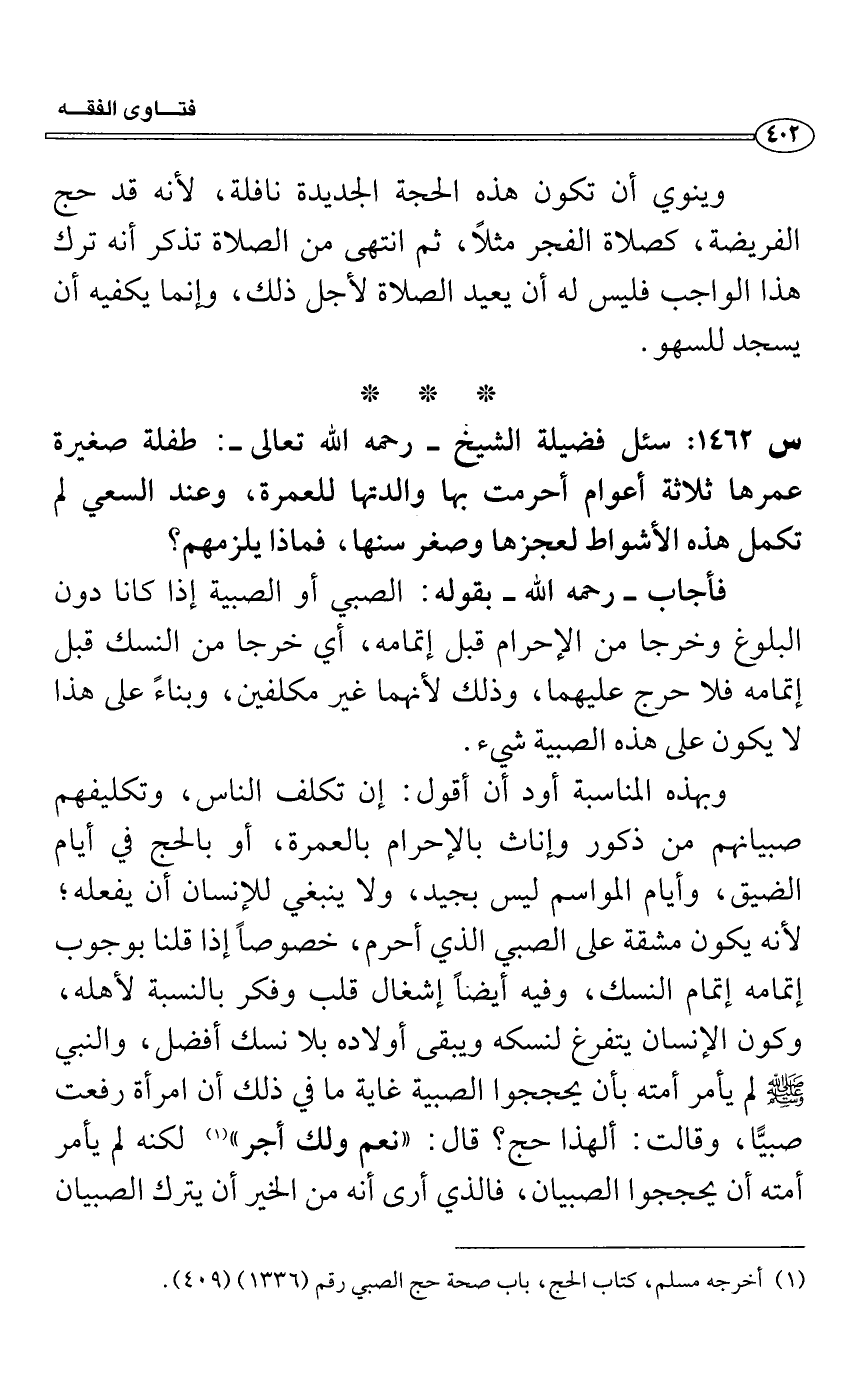 س1462: سئل فضيلة الشيخ- رحمه الله تعالى-: طفلة صغيرة عمرها ثلاثة أعوام أحرمت بها والدتها للعمرة، وعند السعي لم تكمل هذه الأشواط لعجزها وصغر سنها، فماذا يلزمهم؟
