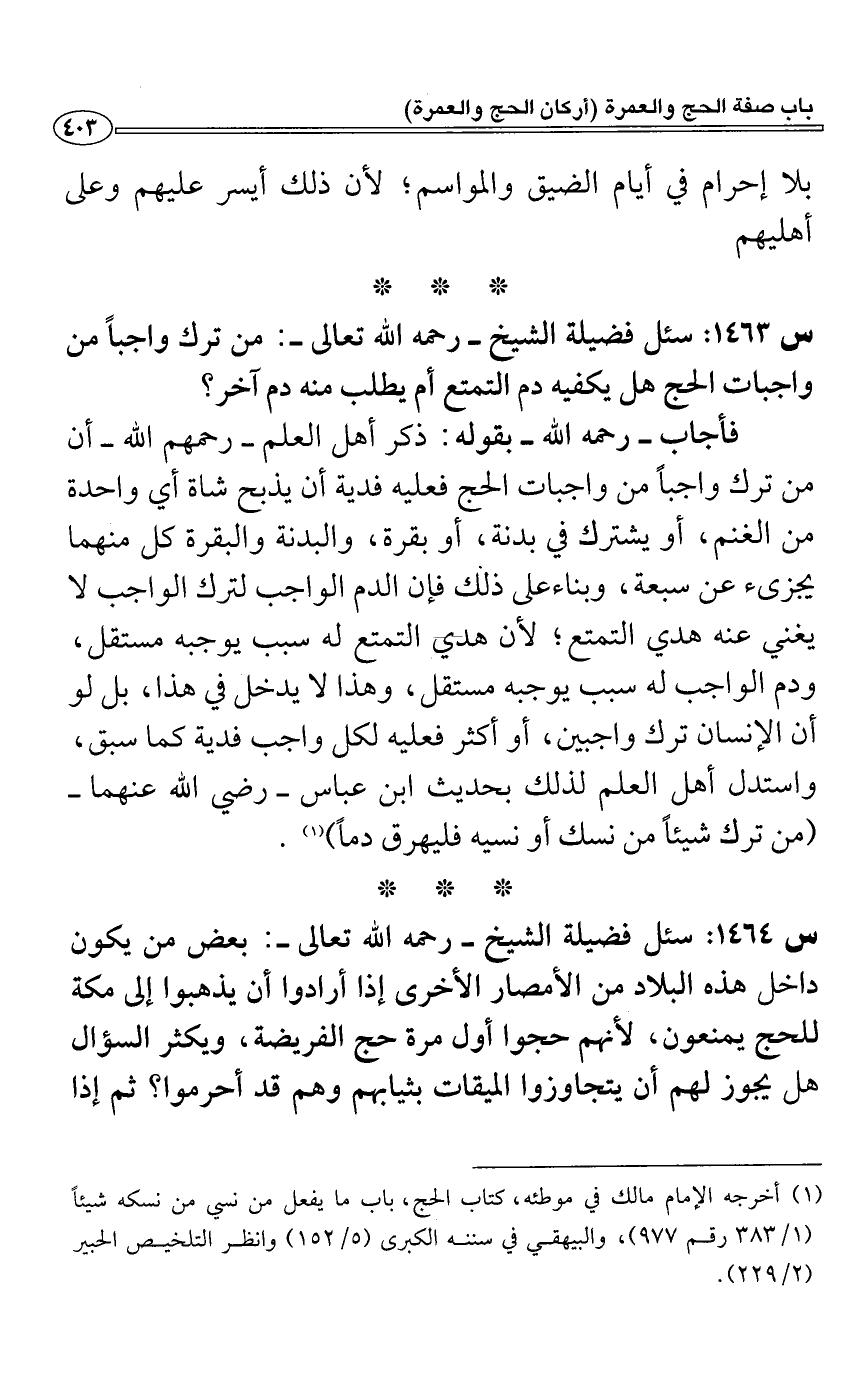 (1) أخرجه الإمام مالك في موطئه، كتاب الحج، باب ما يفعل من نسي من نسكه شيئاً (1/383 رقم 977) ، والبيهقي في سننه الكبرى (5/152) وانظر التلخيص الحبير (2/229) .