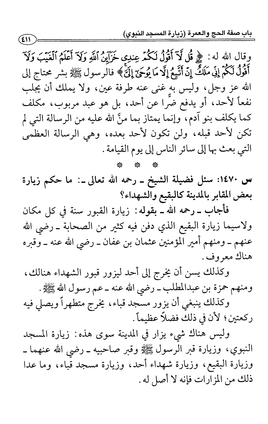 فأجاب- رحمه الله- بقوله: زيارة القبور سنة في كل مكان ولاسيما زيارة البقيع الذي دفن فيه كثير من الصحابة- رضي الله عنهم- ومنهم أمير المؤمنين عثمان بن عفان- رضي الله عنه- وقبره