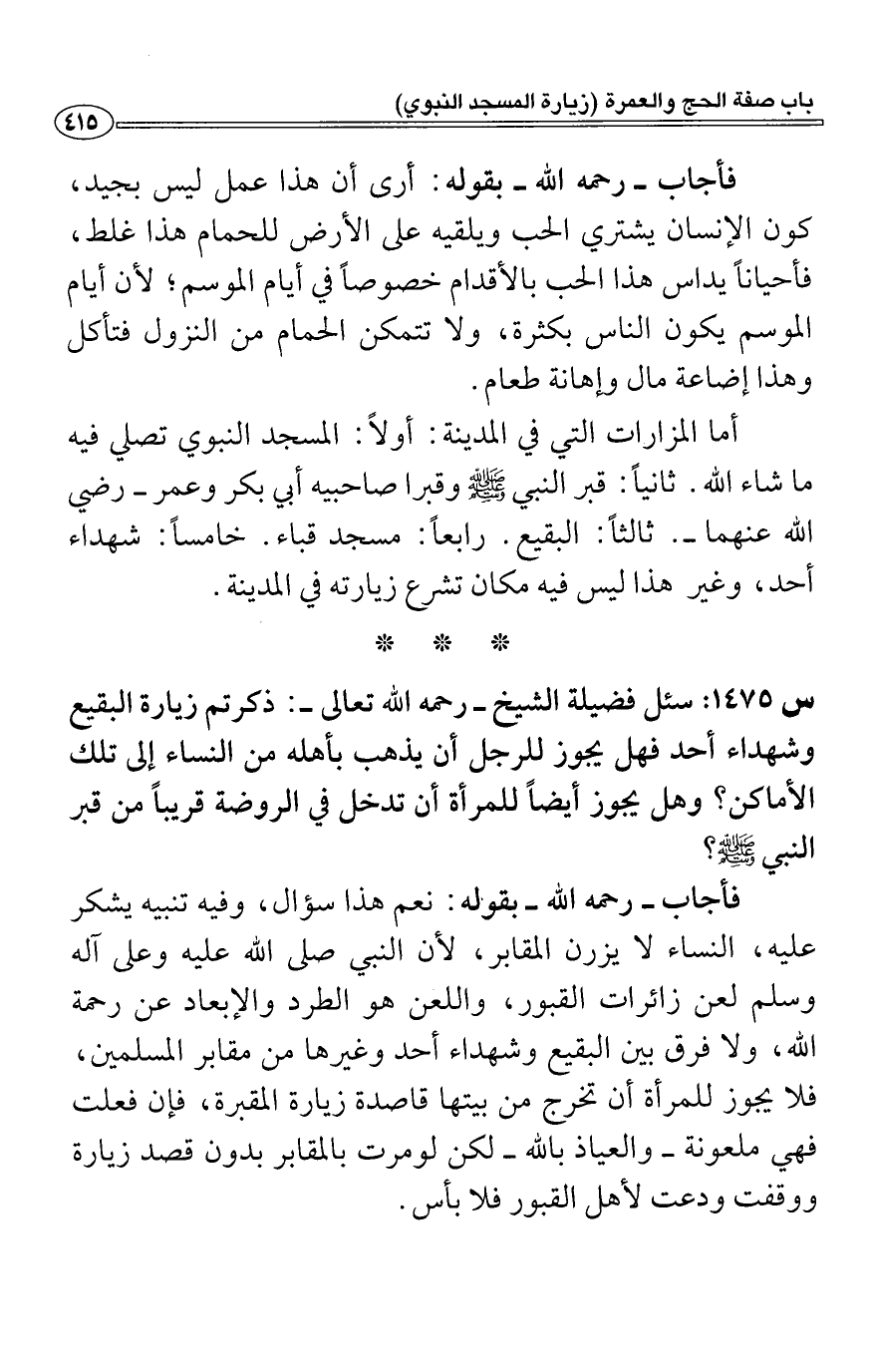 س1475: سئل فضيلة الشيخ- رحمه الله تعالى-: ذكرتم زيارة البقيع وشهداء أحد فهل يجوز للرجل أن يذهب بأهله من النساء إلى تلك الأماكن؟ وهل يجوز أيضاً للمرأة أن تدخل في الروضة قريباً من قبر النبي - صلى الله عليه وسلم -؟