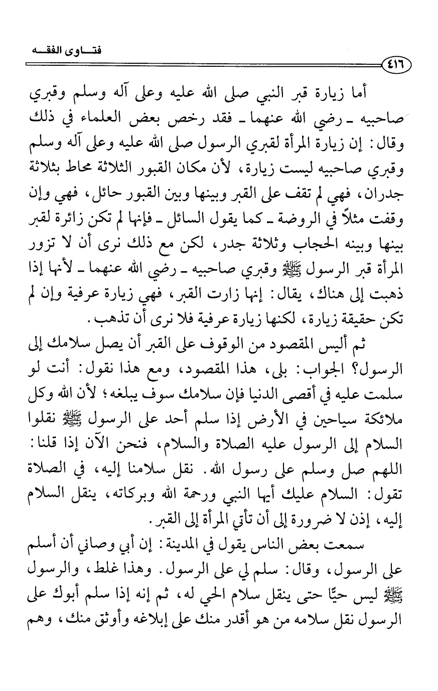 ملائكة سياحين في الأرض إذا سلم أحد على الرسول - صلى الله عليه وسلم - نقلوا السلام إلى الرسول عليه الصلاة والسلام، فنحن الآن إذا قلنا: اللهم صل وسلم على رسول الله. نقل سلامنا إليه، في الصلاة تقول: السلام عليك أيها النبي ورحمة الله وبركاته، ينقل السلام إليه، إذن لا ضرورة إلى أن تأتى المرأة إلى القبر.