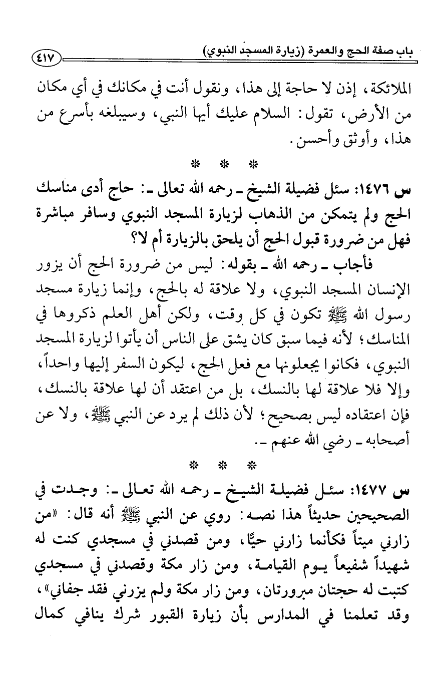 فأجاب- رحمه الله- بقوله: ليس من ضرورة الحج أن يزور الإنسان المسجد النبوي، ولا علاقة له بالحج، وإنما زيارة مسجد رسول الله - صلى الله عليه وسلم - تكون في كل وقت، ولكن أهل العلم ذكروها في المناسك؛ لأنه فيما سبق كان يشق على الناس أن يأتوا لزيارة المسجد النبوي، فكانوا يجعلونها مع فعل الحج، ليكون السفر إليها واحداً، وإلا فلا علاقة لها بالنسك، بل من اعتقد أن لها علاقة بالنسك، فإن اعتقاده ليس بصحيح؛ لأن ذلك لم يرد عن النبي - صلى الله عليه وسلم -، ولا عن أصحابه- رضي الله عنهم-.