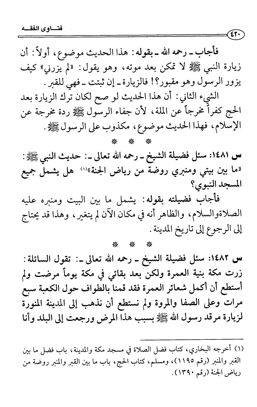 فأجاب- رحمه الله- بقوله: هذا الحديث موضوع، أولاً: أن زيارة النبي - صلى الله عليه وسلم - لا تمكن بعد موته، وهو يقول: "لم يزرني " كيف يزور الرسول وهو مقبور؟ فالزيارة- إن ثبتت- فهي للقبر.