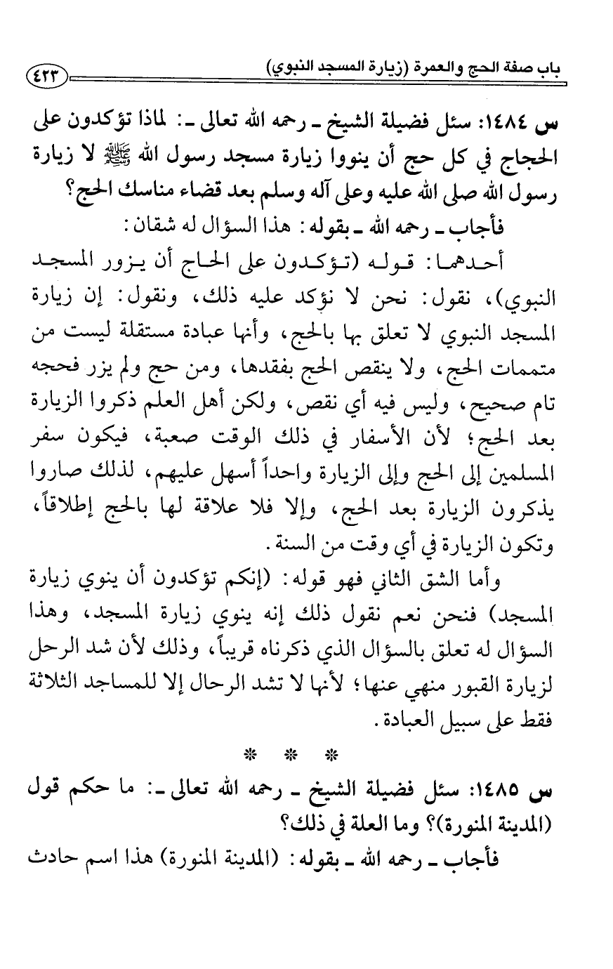 س1484: سئل فضيلة الشيخ- رحمه الله تعالى-: لماذا تؤكدون على الحجاج في كل حج أن ينووا زيارة مسجد رسول الله - صلى الله عليه وسلم - لا زيارة رسول الله صلى الله عليه وعلى آله وسلم بعد قضاء مناسك الحج؟