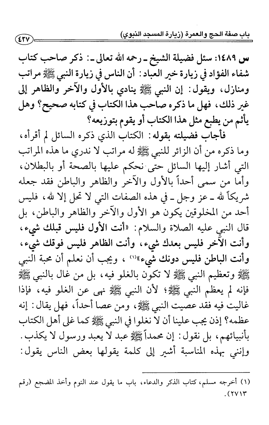 س 1489: سئل فضيلة الشيخ- رحمه الله تعالى-: ذكر صاحب كتاب شفاء الفؤاد في زيارة خير العباد: أن الناس في زيارة النبي - صلى الله عليه وسلم - مراتب ومنازل، ويقول: إن النبي - صلى الله عليه وسلم - ينادي بالأول والآخر والظاهر إلى غير ذلك، فهل ما ذكره صاحب هذا الكتاب في كتابه صحيح؟ وهل يأثم من يطبع مثل هذا الكتاب أو يقوم بتوزيعه؟