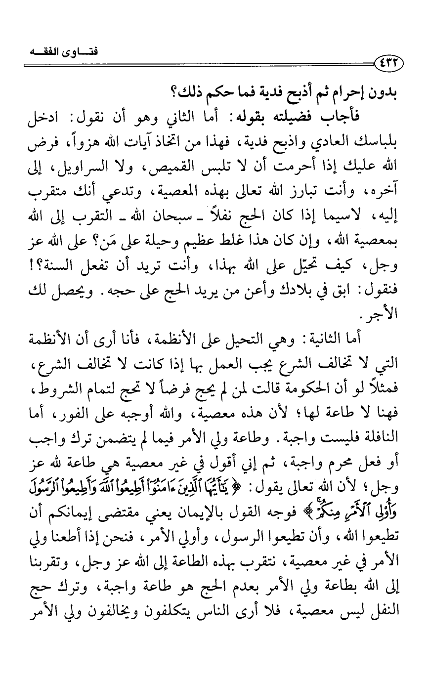 فأجاب فضيلته بقوله: أما الثاني وهو أن نقول: أدخل بلباسك العادي واذبح فدية، فهذا من اتخاذ آيات الله هزواً، فرض الله عليك إذا أحرمت أن لا تلبس القميص، ولا السراويل، إلى آخره، وأنت تبارز الله تعالى بهذه المعصية، وتدعي أنك متقرب إليه، لاسيما إذا كان الحج نفلاً- سبحان الله- التقرب إلى الله بمعصية الله، وإن كان هذا غلط عظيم وحيلة على مَن؟ على الله عز وجل، كيف تحيّل على الله بهذا، وأنت تريد أن تفعل السنة؟!