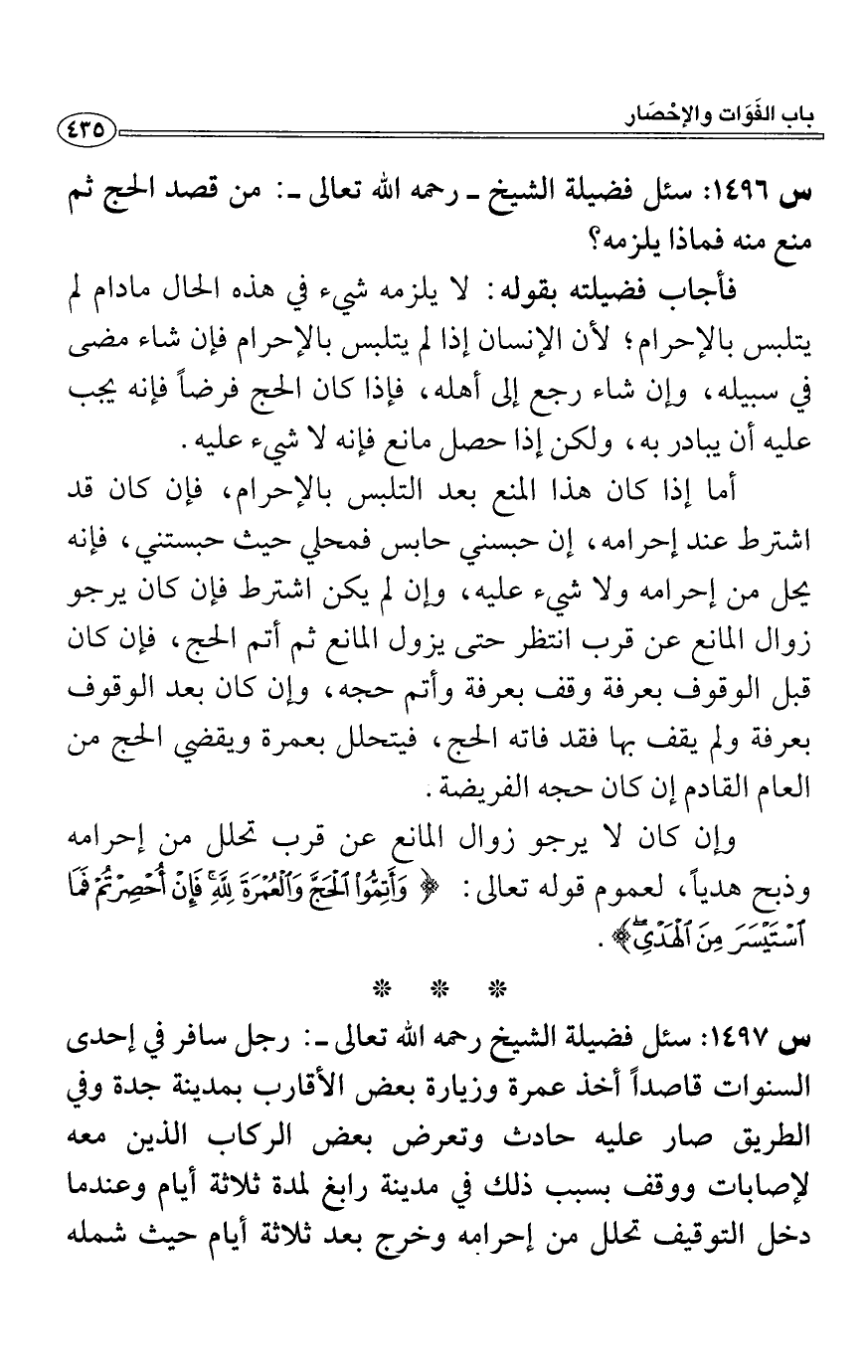 س 1496: سئل فضيلة الشيخ- رحمه الله تعالى-: من قصد الحج ثم منع منه فماذا يلزمه؟