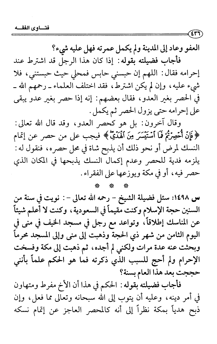 فأجاب فضيلته بقوله: إذا كان هذا الرجل قد اشترط عند إحرامه فقال: اللهم إن حبسني حابس فمحلي حيث حبستني، فلا شيء عليه، وإن لم يكن اشترط، فقد اختلف العلماء- رحمهم الله-