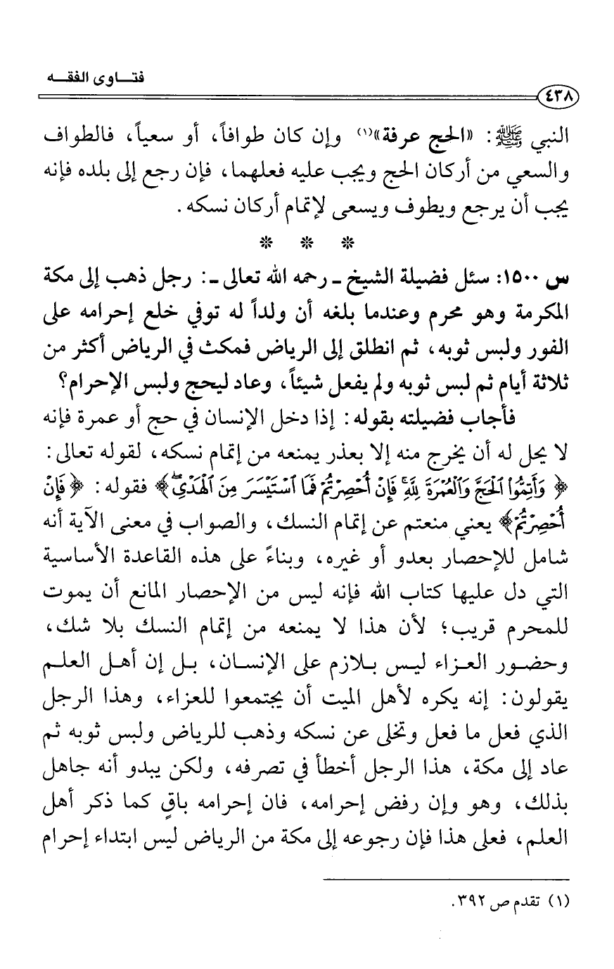 فأجاب فضيلته بقوله: إذا دخل الإنسان في حج أو عمرة فإنه لا يحل له أن يخرج منه إلا بعذر يمنعه من إتمام نسكه، لقوله تعالى: (وَأَتِمُّوا الْحَجَّ وَالْعُمْرَةَ لله فَإِنْ أُحْصِرْتُمْ فَمَا اسْتَيْسَرَ مِنَ الْهَدْيِ) فقوله: (فَإِنْ أُحْصِرْتُمْ) يعني منعتم عن إتمام النسك، والصواب في معنى الآية أنه شامل للإحصار بعدو أو غيره، وبناءً على هذه القاعدة الأساسية التي دل عليها كتاب الله فإنه ليس من الإحصار المانع أن يموت للمحرم قريب؛ لأن هذا لا يمنعه من إتمام النسك بلا شك، وحضور العزاء ليس بلازم على الإنسان، بل إن أهل العلم يقولون: إنه يكره لأهل الميت أن يجتمعوا للعزاء، وهذا الرجل الذي فعل ما فعل وتخلى عن نسكه وذهب للرياض ولبس ثوبه ثم عاد إلى مكة، هذا الرجل أخطأ في تصرفه، ولكن يبدو أنه جاهل بذلك، وهو وإن رفض إحرامه، فان إحرامه باقٍ كما ذكر أهل العلم، فعلى هذا فإن رجوعه إلى مكة من الرياض ليس ابتداء إحرام