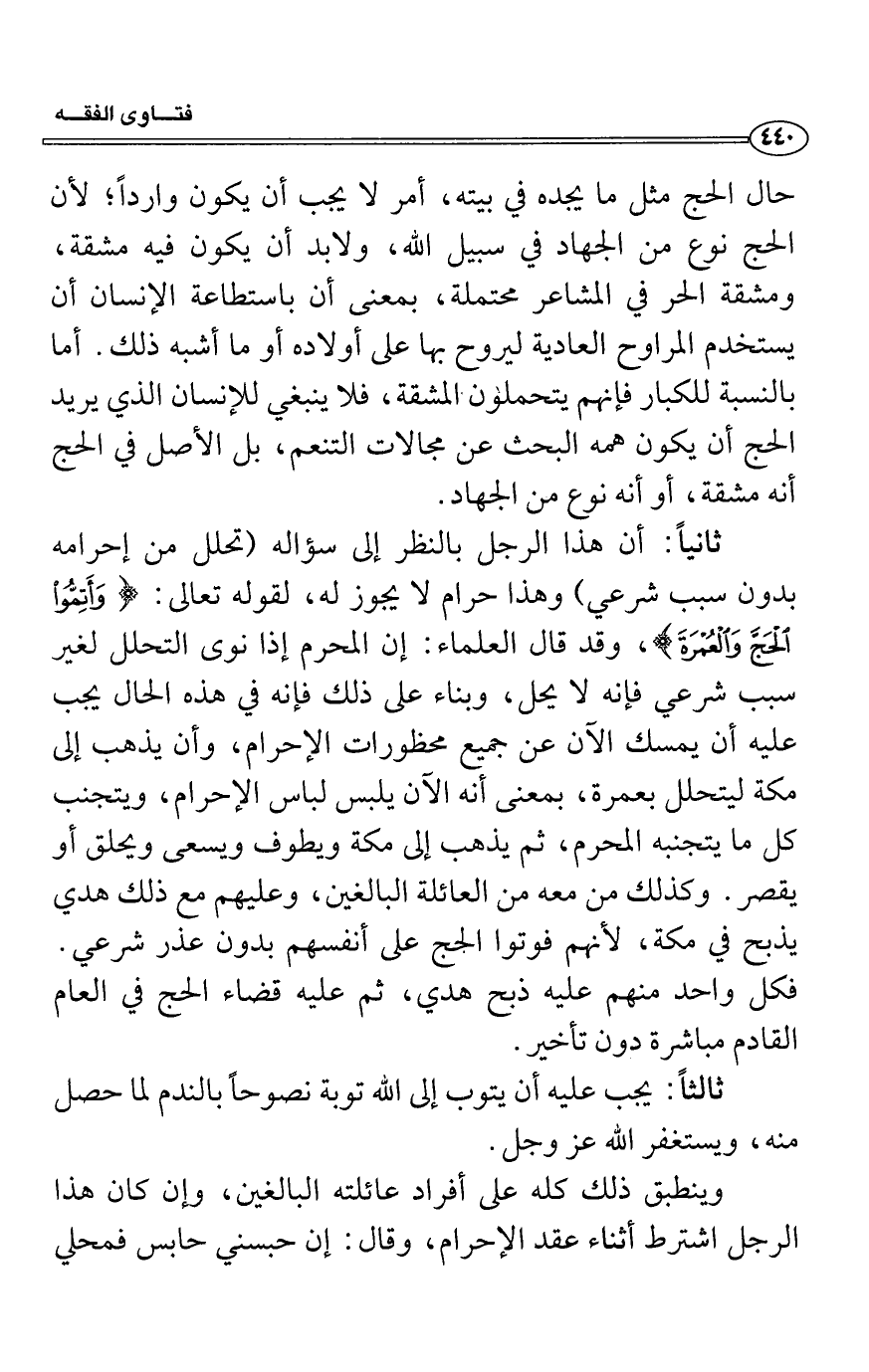 ثانياً: أن هذا الرجل بالنظر إلى سؤاله (تحلل من إحرامه بدون سبب شرعي) وهذا حرام لا يجوز له، لقوله تعالى: (وَأَتِمُّوا الْحَجَّ وَالْعُمْرَةَ) ، وقد قال العلماء: إن المحرم إذا نوى التحلل لغير سبب شرعي فإنه لا يحل، وبناء على ذلك فإنه في هذه الحال يجب عليه أن يمسك الآن عن جميع محظورات الإحرام، وأن يذهب إلى مكة ليتحلل بعمرة، بمعنى أنه الآن يلبس لباس الإحرام، ويتجنب كل ما يتجنبه المحرم، ثم يذهب إلى مكة ويطوف ويسعى ويحلق أو يقصر. وكذلك من معه من العائلة البالغين، وعليهم مع ذلك هدي يذبح في مكة، لأنهم فوتوا الحج على أنفسهم بدون عذر شرعي.