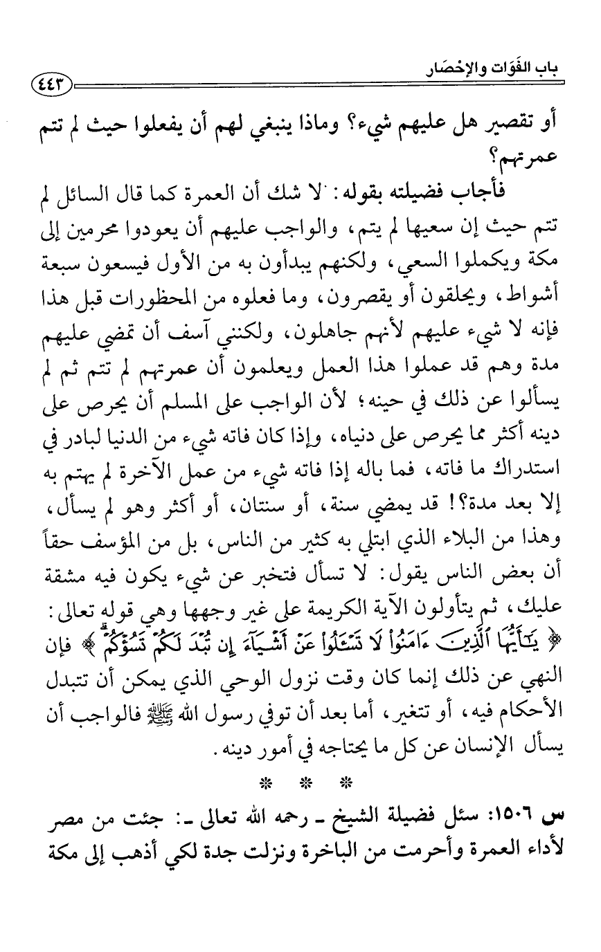 أشواط، ويحلقون أو يقصرون، وما فعلوه من المحظورات قبل هذا فإنه لا شيء عليهم لأنهم جاهلون، ولكنني آسف أن تمضي عليهم مدة وهم قد عملوا هذا العمل ويعلمون أن عمرتهم لم تتم ثم لم يسألوا عن ذلك في حينه؛ لأن الواجب على المسلم أن يحرص على دينه أكثر مما يحرص على دنياه، وإذا كان فاته شيء من الدنيا لبادر في استدراك ما فاته، فما باله إذا فاته شيء من عمل الآخرة لم يهتم به إلا بعد مدة؟! قد يمضي سنة، أو سنتان، أو أكثر وهو لم يسأل، وهذا من البلاء الذي ابتلي به كثير من الناس، بل من المؤسف حقاً أن بعض الناس يقول: لا تسأل فتخبر عن شيء يكودن فيه مشقة عليك، ثم يتأولون الآية الكريمة على غير وجهها وهي قوله تعالى: (يَا أَيُّهَا الَّذِينَ آَمَنُوا لَا تَسْأَلُوا عَنْ أَشْيَاءَ إِنْ تُبْدَ لَكُمْ تَسُؤْكُمْ) فإن النهي عن ذلك إنما كان وقت نزول الوحي الذي يمكن أن تتبدل الأحكام فيه، أو تتغير، أما بعد أن توفي رسول الله - صلى الله عليه وسلم - فالواجب أن يسأل الإنسان عن كل ما يحتاجه في أمور دينه.