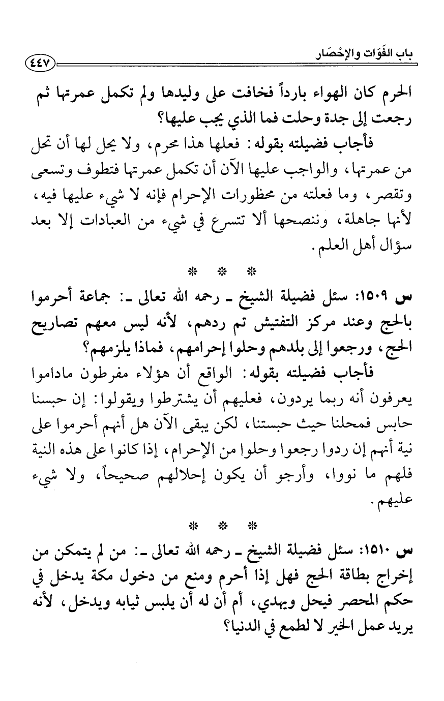 فأجاب فضيلته بقوله: الواقع أن هؤلاء مفرطون ماداموا يعرفون أنه ربما يردون، فعليهم أن يشترطوا ويقولوا: إن حبسنا حابس فمحلنا حيث حبستنا، لكن يبقى الآن هل أنهم أحرموا على