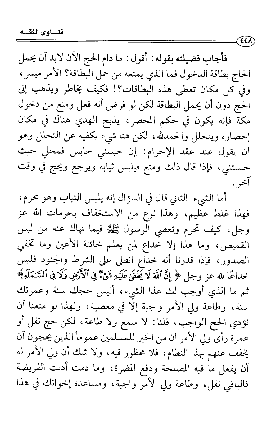 فأجاب فضيلته بقوله: أقول: ما دام الحج الآن لابد أن يحمل الحاج بطاقة الدخول فما الذي يمنعه من حمل البطاقة؟ الأمر ميسر، وفي كل مكان تعطى هذه البطاقات؟! فكيف يخاطر ويذهب إلى