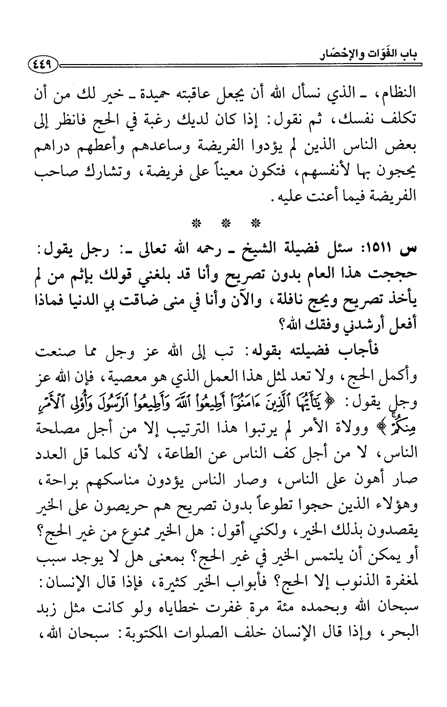 فأجاب فضيلته بقوله: تب إلى الله عز وجل مما صنعت وأكمل الحج، ولا تعد لمثل هذا العمل الذي هو معصية، فإن الله عز وجل يقول: (يَا أَيُّهَا الَّذِينَ آَمَنُوا أَطِيعُوا الله وَأَطِيعُوا الرَّسُولَ وَأُولِي الْأَمْرِ مِنْكُمْ) وولاة الأمر لم يرتبوا هذا الترتيب إلا من أجل مصلحة الناس، لا من أجل كف الناس عن الطاعة، لأنه كلما قل العدد صار أهون على الناس، وصار الناس يؤدون مناسكهم براحة، وهؤلاء الذين حجوا تطوعاً بدون تصريح هم حريصون على الخير يقصدون بذلك الخير، ولكني أقول: هل الخير ممنوع من غير الحج؟ أو يمكن أن يلتمس الخير في غير الحج؟ بمعنى هل لا يوجد سبب لمغفرة الذنوب إلا الحج؟ فأبواب الخير كثيرة، فإذا قال الإنسان: سبحان الله وبحمده مائة مرة غفرت خطاياه ولو كانت مثل زبد البحر، وإذا قال الإنسان خلف الصلوات المكتوبة: سبحان الله،