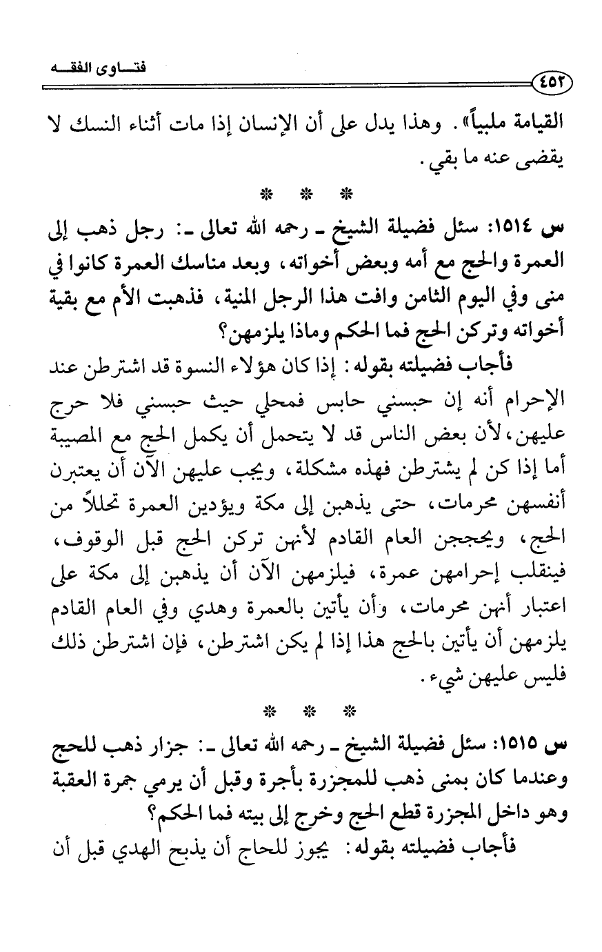 س 1514: سئل فضيلة الشيخ- رحمه الله تعالى-: رجل ذهب إلى العمرة والحج مع أمه وبعض أخواته، وبعد مناسك العمرة كانوا في منى وفي اليوم الثامن وافت هذا الرجل المنية، فذهبت الأم مع بقية أخواته وتركن الحج فما الحكم وماذا يلزمهن؟