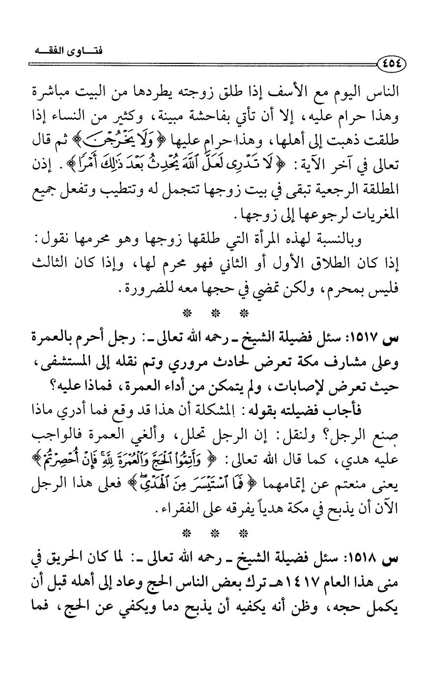 س 1517: سئل فضيلة الشيخ- رحمه الله تعالى-: رجل أحرم بالعمرة وعلى مشارف مكة تعرض لحادث مروري وتم نقله إلى المستشفى، حيث تعرض لإصابات، ولم يتمكن من أداء العمرة، فماذا عليه؟