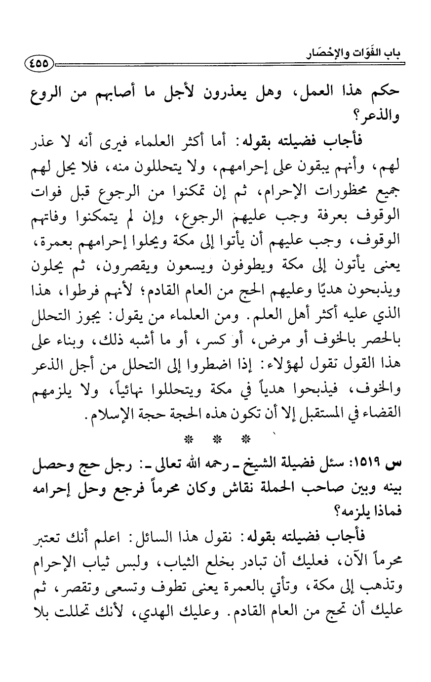 فأجاب فضيلته بقوله: أما أكثر العلماء فيرى أنه لا عذر لهم، وأنهم يبقون على إحرامهم، ولا يتحللون منه، فلا يحل لهم جميع محظورات الإحرام، ثم إن تمكنوا من الرجوع قبل فوات الوقوف بعرفة وجب عليهم الرجوع، وإن لم يتمكنوا وفاتهم الوقوف، وجب عليهم أن يأتوا إلى مكة ويحلوا إحرامهم بعمرة، يعنى يأتون إلى مكة ويطوفون ويسعون ويقصرون، ثم يحلون ويذبحون هديًا وعليهم الحج من العام القادم؛ لأنهم فرطوا، هذا الذي عليه أكثر أهل العلم. ومن العلماء من يقول: يجوز التحلل بالحصر بالخوف أو مرض، أو كسر، أو ما أشبه ذلك، وبناء على هذا القول نقول لهؤلاء: إذا اضطروا إلى التحلل من أجل الذعر والخوف، فيذبحوا هدياً في مكة ويتحللوا نهائياً، ولا يلزمهم